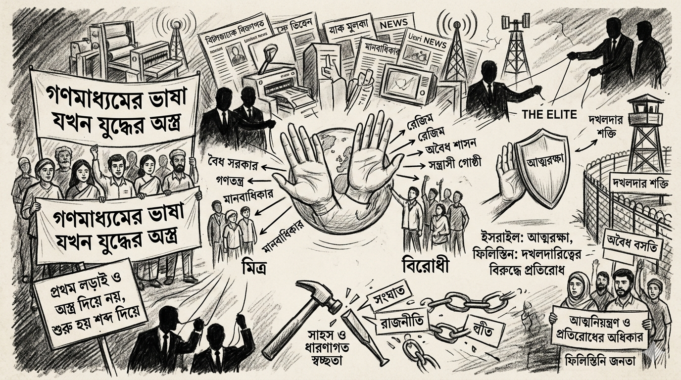 আন্তর্জাতিক সম্পর্কের ক্ষেত্রে নির্দিষ্ট কিছু শব্দ মিত্রদের বৈধতা দেয় এবং বিরোধীদের অবৈধ ঘোষণা করে। এই শব্দগুলো কৌশলে ব্যবহার করা হয় গণমাধ্যমে। এই কৌশল কাজে লাগানো হয় জনমত গঠনে। গণমাধ্যমের ভাষাও