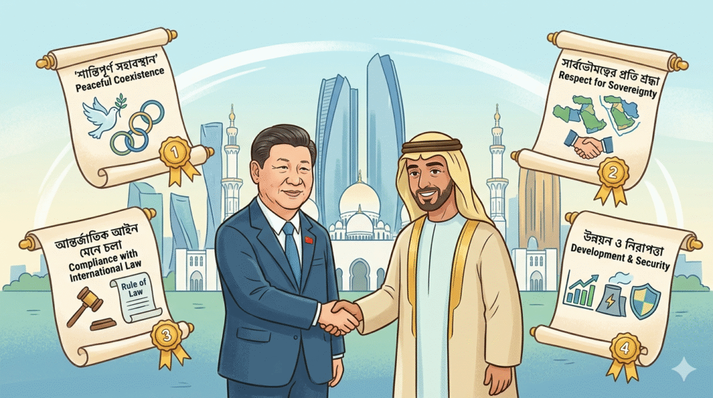 পাঠক, একটু ঠান্ডা মাথায় ভেবে দেখুন প্রস্তাবগুলো নিয়ে। ইরান যুদ্ধকে কেন্দ্র করে মধ্যপ্রাচ্যের আরাম-আয়েশে থাকা সরকারগুলো যখন একচেটিয়াভাবে আমেরিকা ও ইসরাইলকে সমর্থন করে যাচ্ছিলো, ঠিক তখনি মধ্যপ্রাচ্য সফরে গিয়েছেন চীনের প্রেসিডেন্ট। হরমুজ প্রণালীকে নিয়ে আমেরিকার পাগলামী আর ইরান যুদ্ধপরিস্থিতির বাস্তবতায় আমেরিকার প্রতি আস্থা হারিয়ে ফেলছেন আরব নেতারা। আর এই সুযোগটাই কাজে লাগাতে চাচ্ছে চীন। পশ্চিমের প্রতি মধ্যপ্রাচ্যের আস্থায় যখন ফাঁটল ধরেছে, তখনি বাস্তব কিছু কথা নিয়ে হাজির হয়েছেন শি। তাদেরকে বোঝাতে চাচ্ছেন- শুধু শুধু ইরানের সাথে বৈরিতা করে লাভ নেই। বরং তোমরা মিলেমিশে থাকো। আদতে পশ্চিম তোমাদের কারো বন্ধু না।