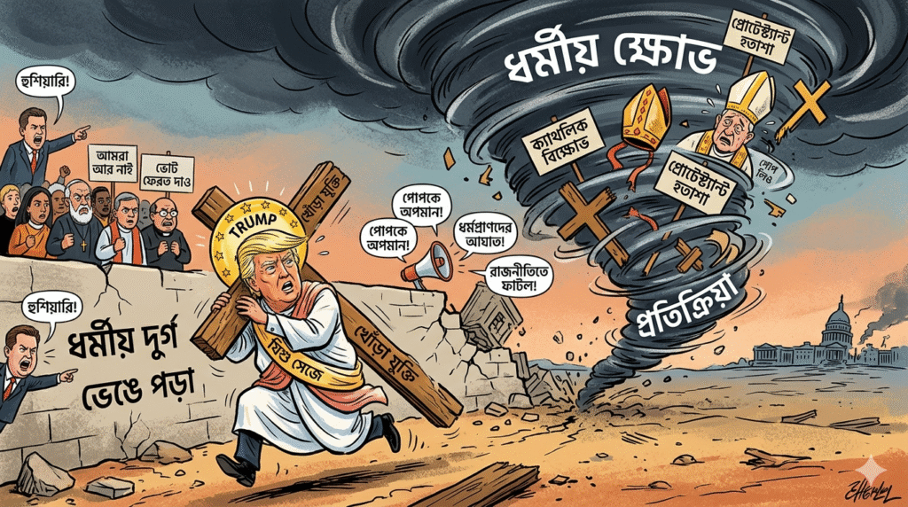 সিবিএস চ্যানেলের সিক্সটি মিনিটস অনুষ্ঠানে পোপের বিরুদ্ধে করা ট্রাম্পের কড়া মন্তব্য এখন তার জন্য বুমেরাং হয়ে দাঁড়িয়েছে। ধর্মীয় রক্ষণশীলদের কাছে যে ট্রাম্প ছিলেন ত্রাতা, সেই ট্রাম্পের প্রতি এখন আর কোনো অন্ধ সমর্থন দেখা যাচ্ছে না। প্রভাবশালী রেডিও ব্যক্তিত্ব এরিক এরিকসন সোজাসুজি হুঁশিয়ারি দিয়ে বলেছেন, ধর্মপ্রাণ ভোটাররা যা ভেবে ট্রাম্পকে ভোট দিয়েছিলেন, তারা আসলে তা পাননি। ট্রাম্পের অভিবাসন প্রতিশ্রুতি পূরণ না হওয়া, জিনিসপত্রের লাগামহীন দাম আর ইরানের সাথে যুদ্ধের উত্তেজনা নিয়ে সমর্থকরা আগে থেকেই বিরক্ত ছিলেন। এর ওপর পোপকে আক্রমণ আর যিশু সেজে নিজেকে দেবতুল্য প্রমাণের চেষ্টা যেন কফিনে শেষ পেরেক ঠুকে দিয়েছে।